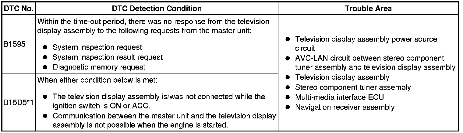 These DTCs will be stored when an AVC-LAN communication error occurs between the stereo component tuner assembly and television display assembly.