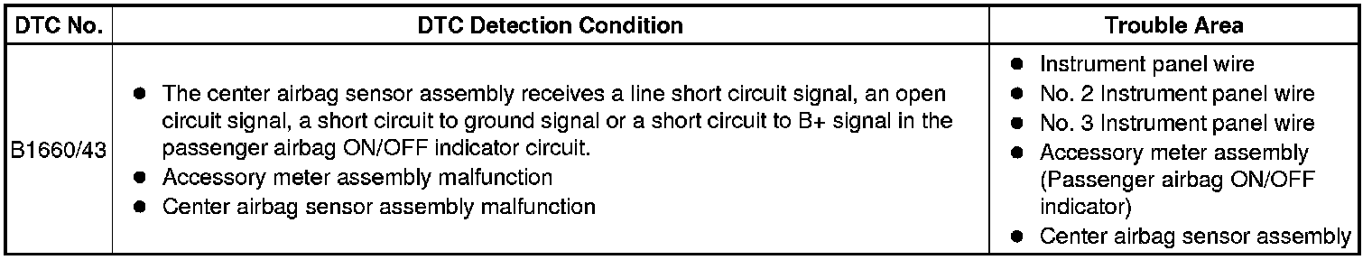 DTC B1660/43 is stored when a malfunction is detected in the passenger airbag ON/OFF indicator circuit.