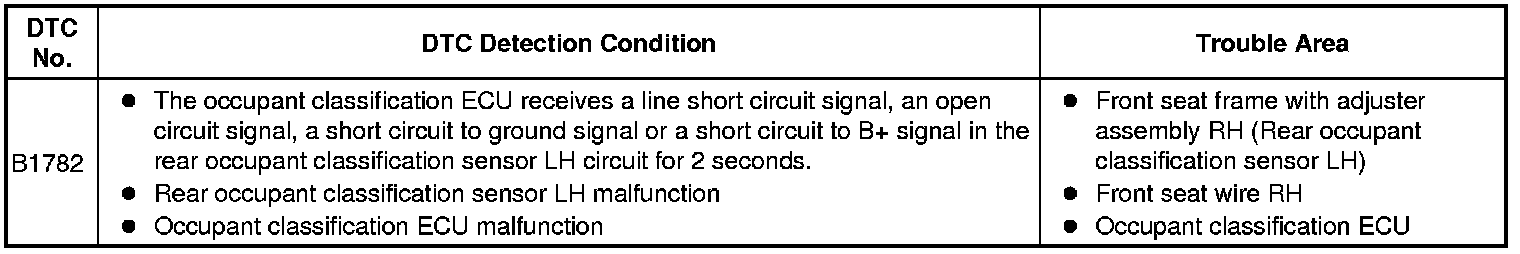 DTC B1782 is recorded when a malfunction is detected in the rear occupant classification sensor LH circuit.