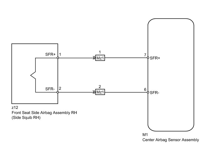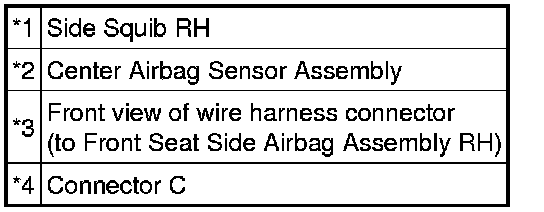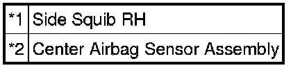 The side squib RH circuit consists of the center airbag sensor assembly and front seat side airbag assembly RH.