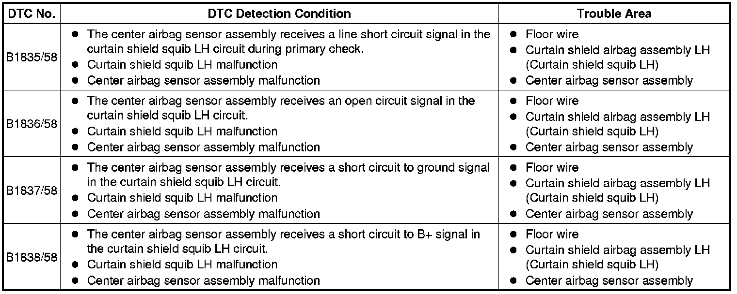 These DTCs are stored when a malfunction is detected in the curtain shield squib LH circuit.