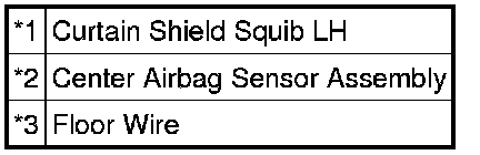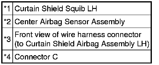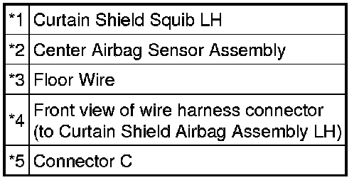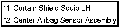 The curtain shield squib LH circuit consists of the center airbag sensor assembly and curtain shield airbag assembly LH.