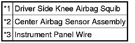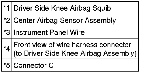 The driver side knee airbag squib circuit consists of the center airbag sensor assembly and driver side knee airbag assembly.