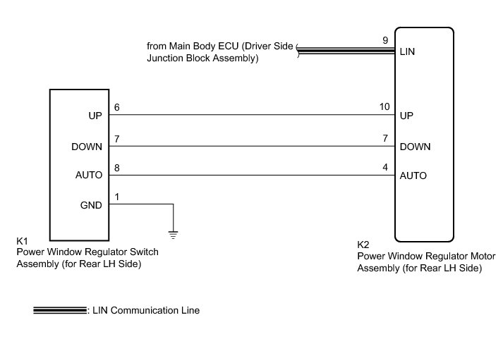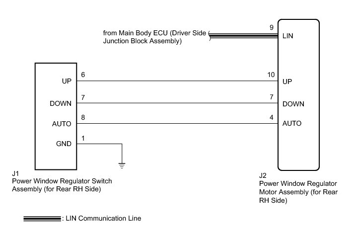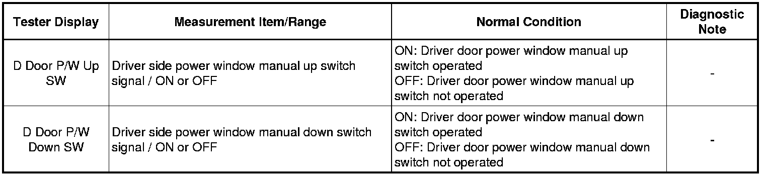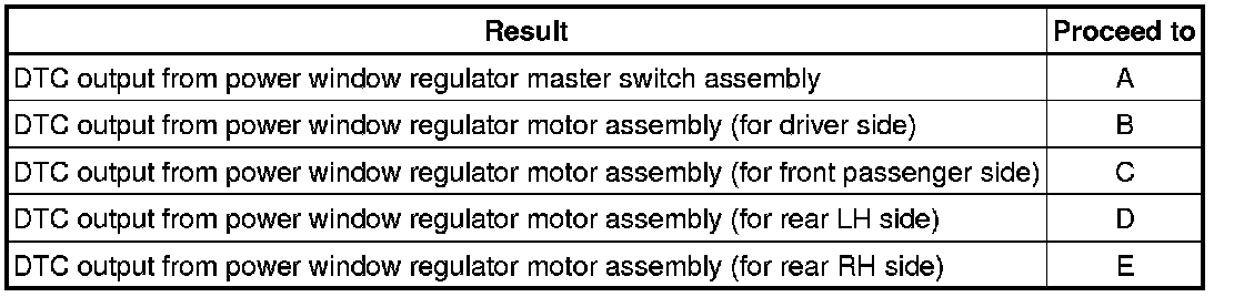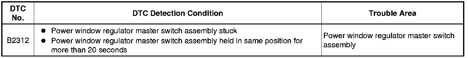 This DTC is output when the ECU built into the regulator motor determines that the power window regulator master switch assembly or power window regulator switch assembly is stuck.