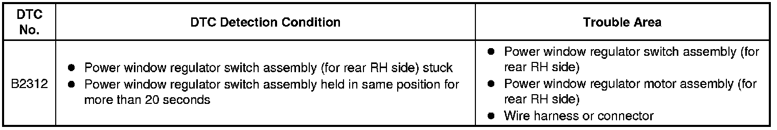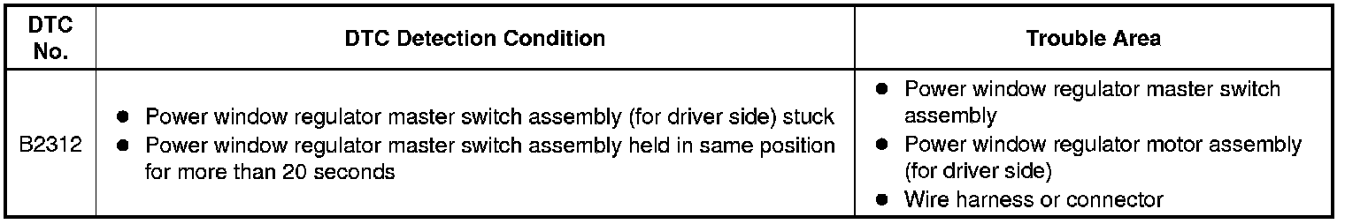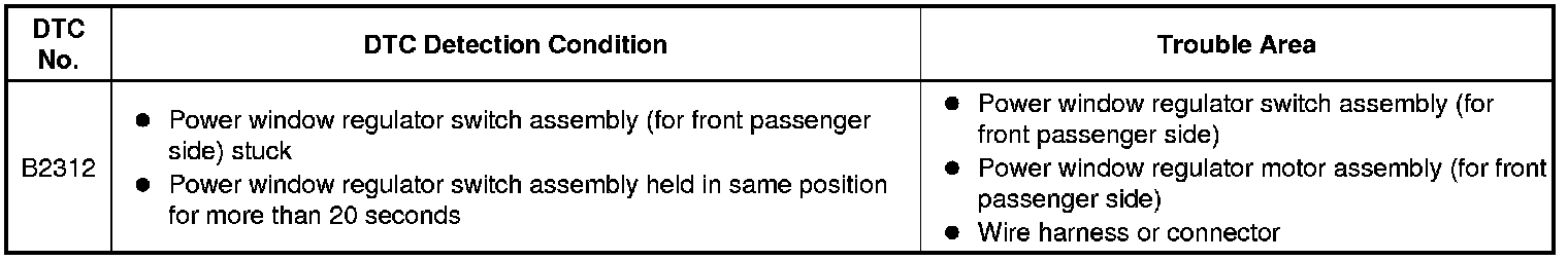 DTC B2312 can be stored in the power window regulator master switch assembly and in each power window regulator motor assembly (power window ECU).