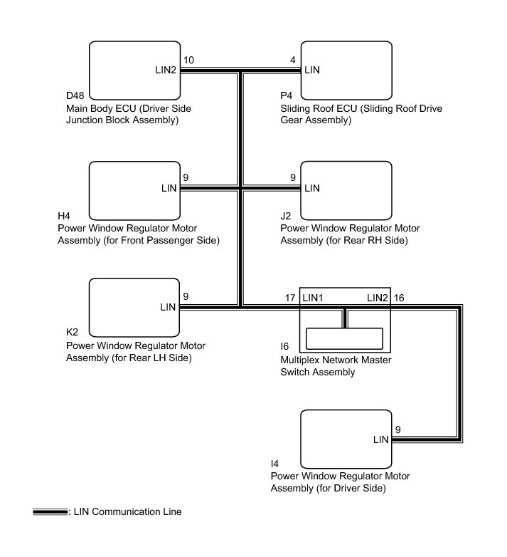 The main body ECU (driver side junction block assembly) monitors communication between all the ECUs connected to the door bus lines. When the main body ECU (driver side junction block assembly) detects errors in communication with all the ECUs connected to the door bus lines at 2.6-second intervals and 3 times in a row, DTC B2325 will be stored.