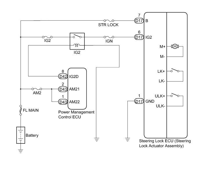 The steering lock ECU (steering lock actuator assembly) receives power from the IG2 relay. When the voltage value indicated by the IG signal from the certification ECU (smart key ECU assembly) equals to the voltage that is applied to the steering lock ECU (steering lock actuator assembly), the steering wheel will be unlocked. The steering lock ECU (steering lock actuator assembly) will not lock the steering wheel when power from the IG2 relay is present. This prevents the steering from being locked while the vehicle is moving.