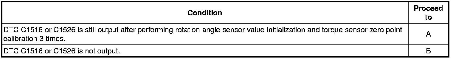 If DTC C1516 or C1526 is output even though the rotation angle sensor value initialization and torque sensor zero point calibration have been performed, confirm the procedure again, and perform the calibration and initialization 3 times.