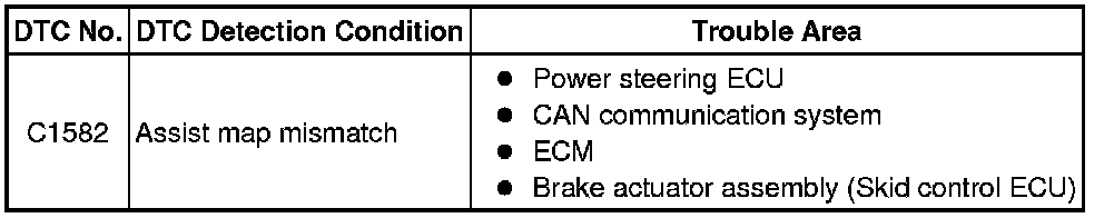 When an incorrect ECM or brake actuator assembly (skid control ECU) is installed after the assist map has been recorded in the power steering ECU, then DTC C1582 is stored because the data does not match the vehicle specifications.