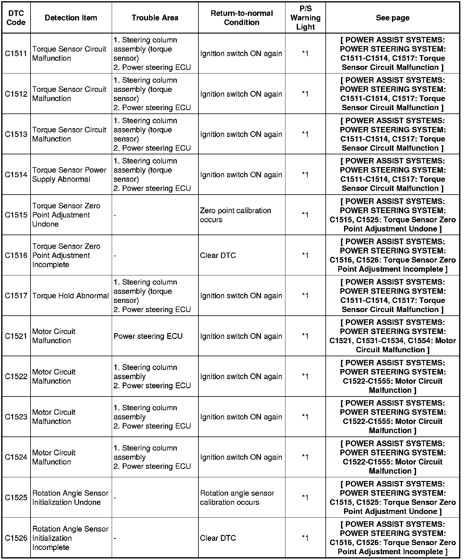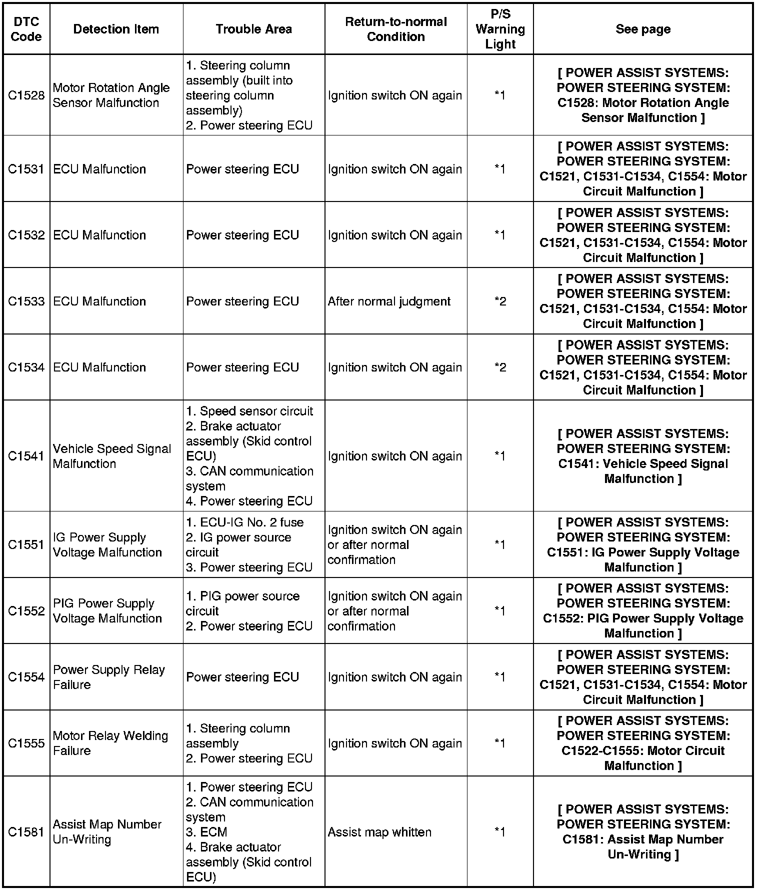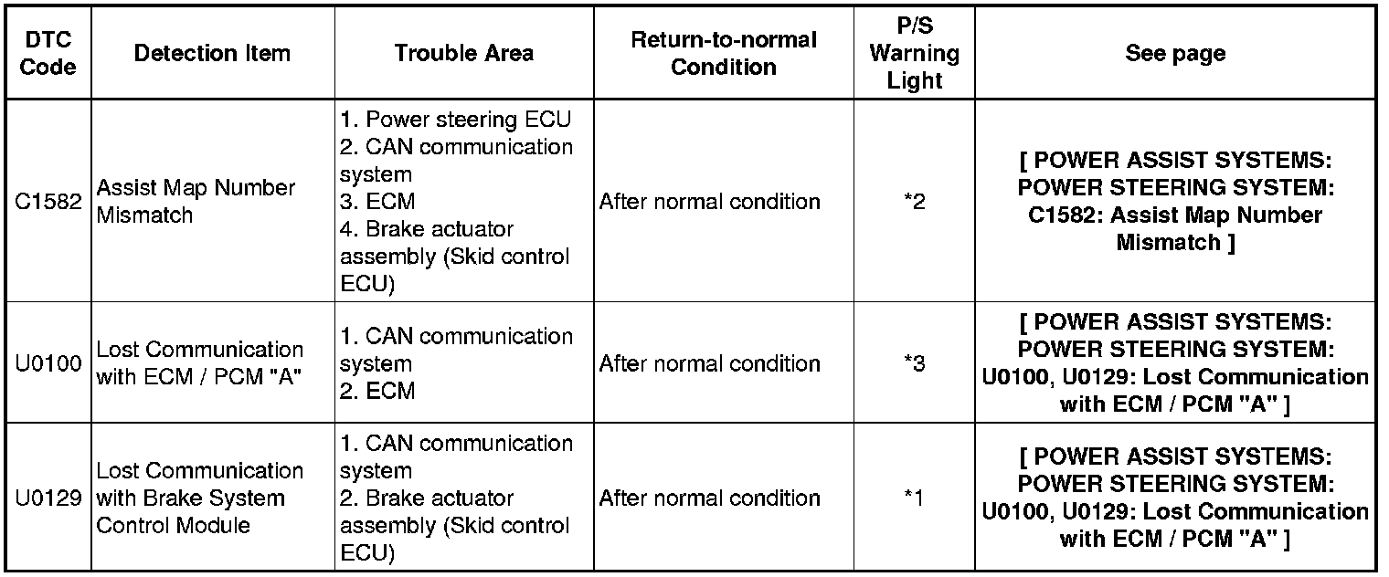 POWER ASSIST SYSTEMS: POWER STEERING SYSTEM: DIAGNOSTIC TROUBLE CODE CHART