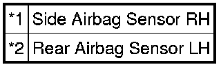 The side collision sensor LH circuit (to determine deployment of the front seat side airbag assembly LH and curtain shield airbag assembly LH) is composed of the center airbag sensor assembly, rear airbag sensor LH and side airbag sensor LH.