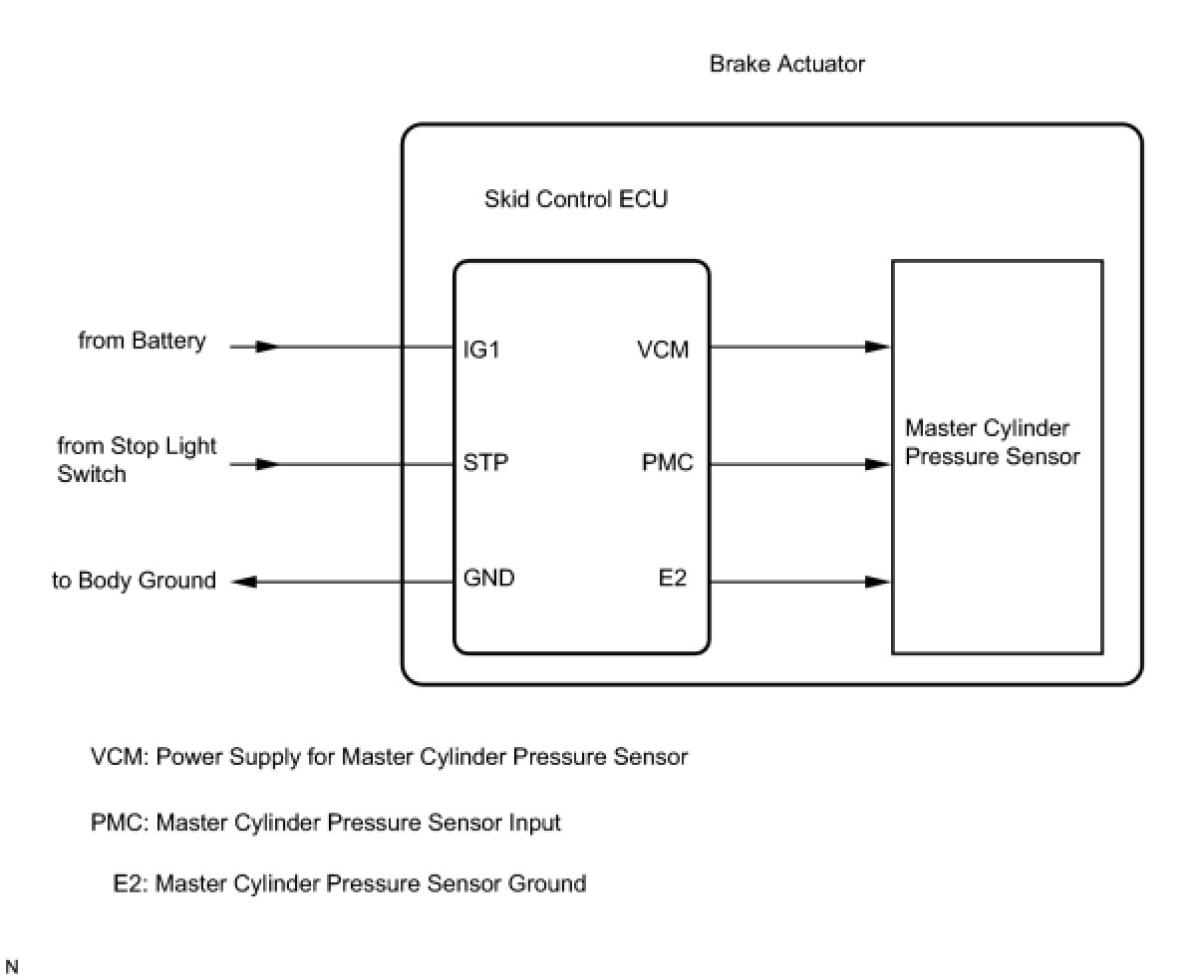 Master cylinder pressure sensor is connected to the skid control ECU in the brake actuator assembly.