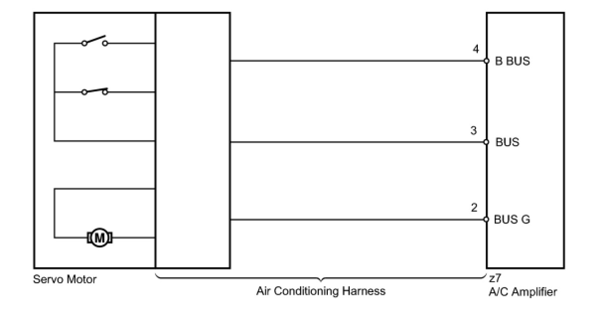 The air conditioning harness connects the A/C amplifier and each servo. The A/C amplifier supplies power and sends operation instructions to each servo through the air conditioning harness. Each servo sends the damper position information to the A/C amplifier.