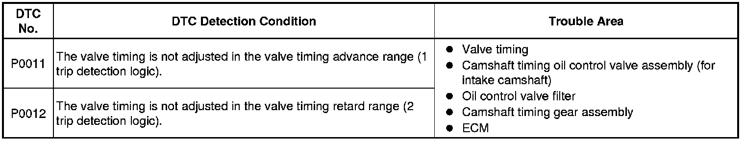 DTC P0011 or P0012 may be stored when foreign objects in the engine oil are caught in some parts of the system. The DTC will remain stored even if the system returns to normal after a short time. These foreign objects may then be captured by the oil filter.