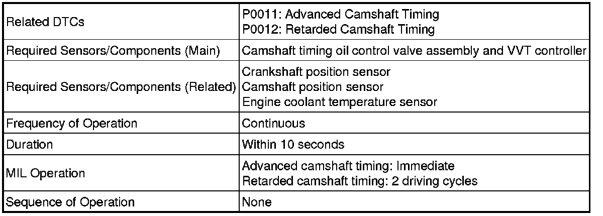 * DTC P0011 or P0012 may be stored when foreign objects in the engine oil are caught in some parts of the system. The DTC will remain set even if the system returns to normal after a short time. Those foreign objects may then be captured by the oil filter.