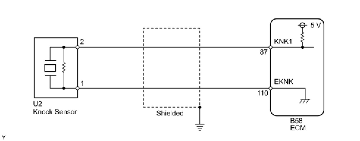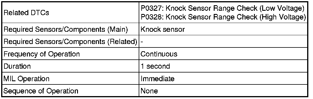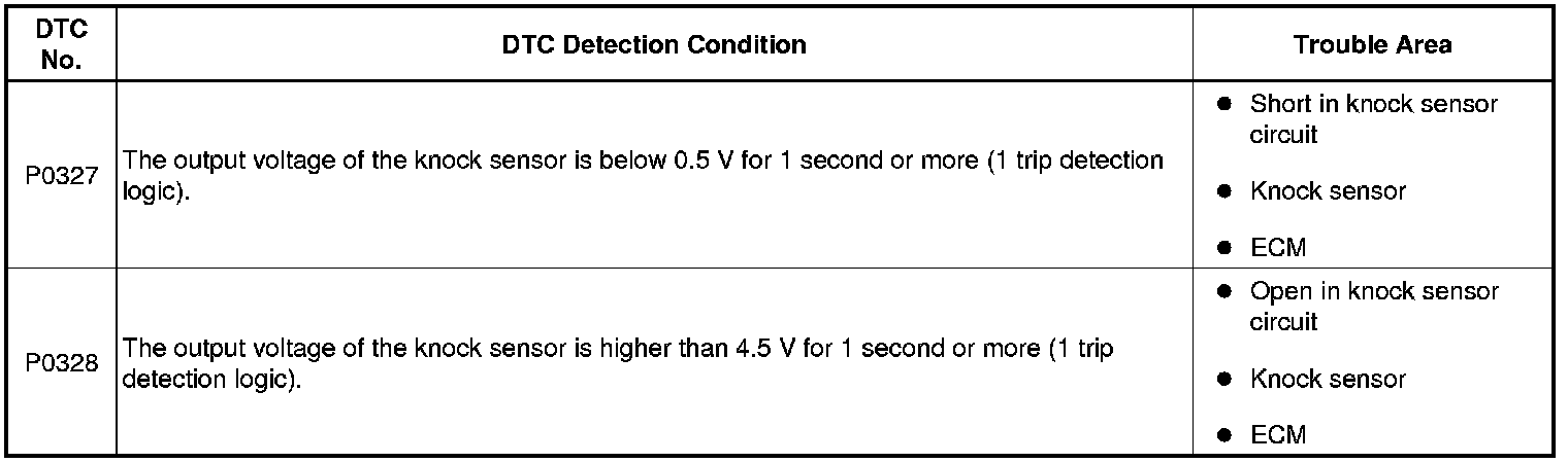 If the output voltage transmitted by the knock sensor remains low or high for more than 1 second, the ECM interprets this as a malfunction in the sensor circuit, and stores a DTC.
