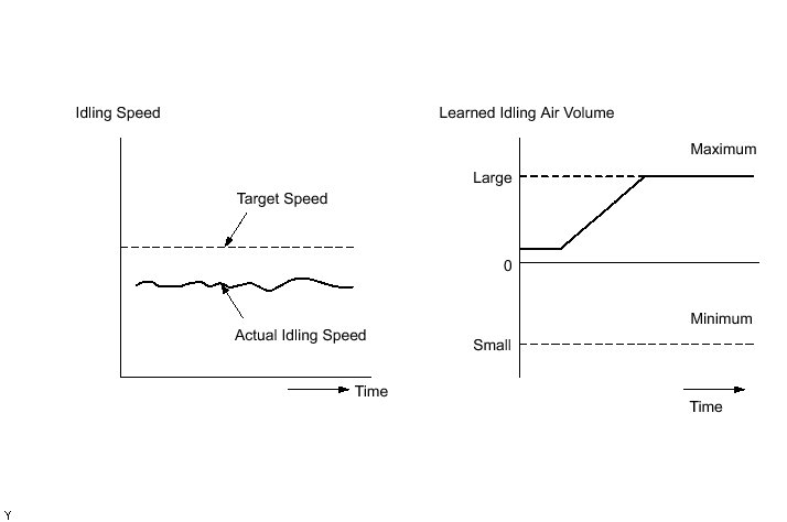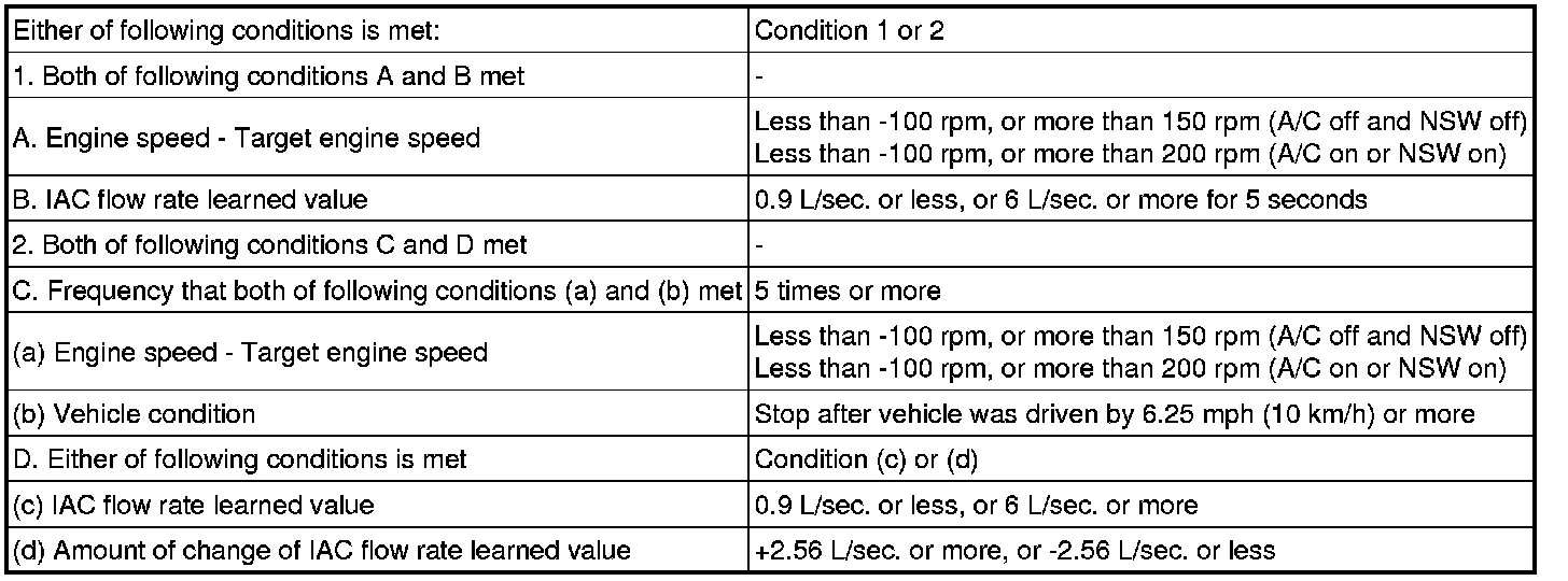 - The difference between the target engine idling speed and actual engine idling speed exceeds the threshold and the IAC flow rate learned value is stuck at the upper or lower limit for 5 seconds or more.
