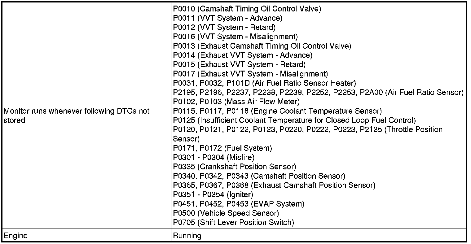 - After driving at a vehicle speed of 6.25 mph (10 km/h) or more, the difference between the target and actual engine idling speed exceeds the threshold 5 times or more during a driving cycle, and then the system determines that the IAC flow rate learned value is stuck at the upper or lower limit, or that the IAC flow rate learned value has been changed by an amount that exceeds the threshold.