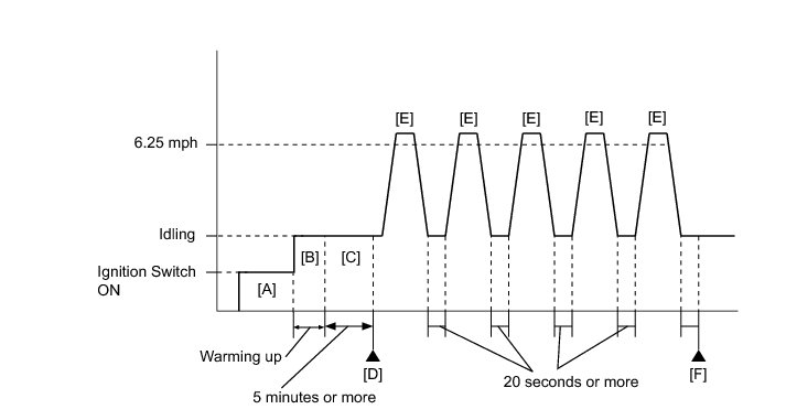 13. Accelerate the vehicle to 6.25 mph (10 km/h) or more, and then idle the engine for 20 seconds or more [E].