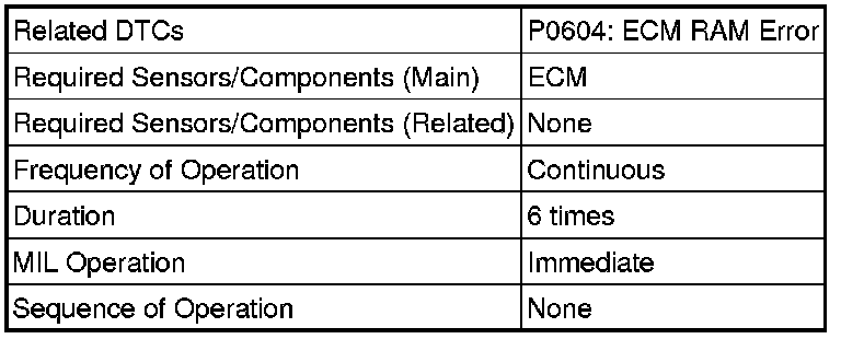The ECM continuously monitors its internal memory status. This self-check ensures that the ECM is functioning properly. It is diagnosed by internal "mirroring" of the main CPU and sub CPU to detect Random Access Memory (RAM) errors. If outputs from these CPUs are different and deviate from the standard, the ECM illuminates the MIL and stores the DTC immediately.