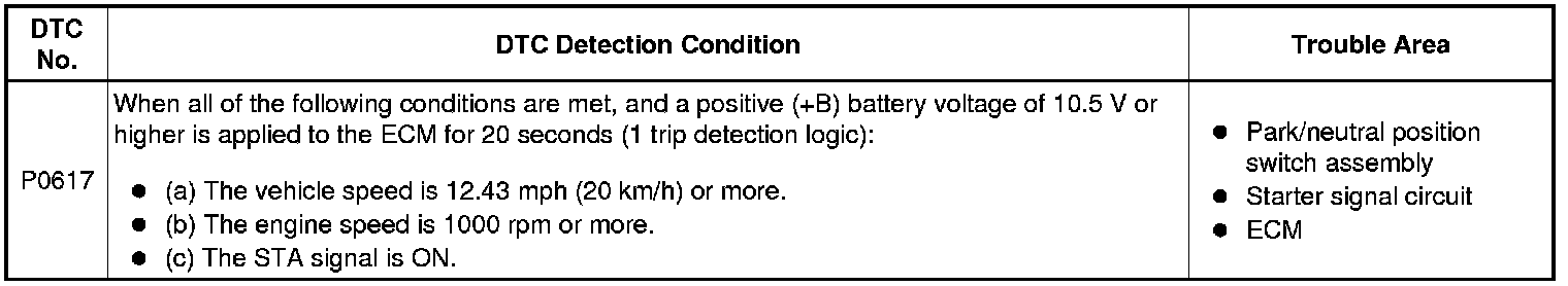 While the engine is being cranked, battery voltage is applied to terminal STA of the ECM. If the ECM detects the Starter Control (STA) signal while the vehicle is being driven, it determines that there is a malfunction in the STA circuit. The ECM then illuminates the MIL and stores the DTC.