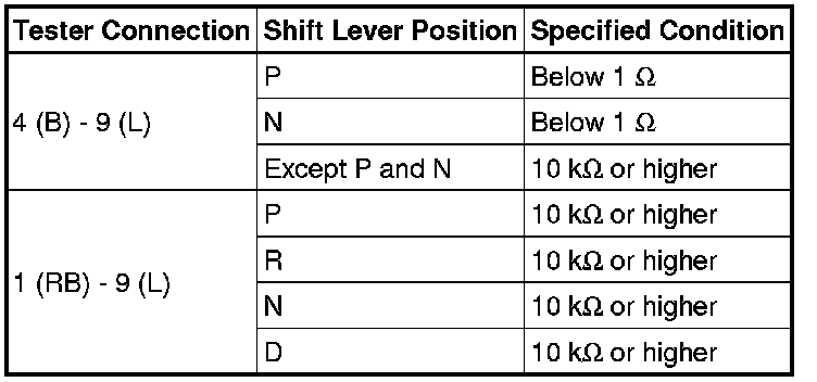 (b) Measure the resistance according to the value(s) in the table below when the shift lever is moved to each position.