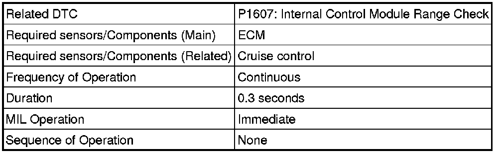 The ECM continuously monitors its main and sub CPUs while cruise control is operating. This self-check ensures that the ECM is functioning properly. If outputs from the CPUs are different and deviate from the standard, the ECM illuminates the MIL and stores the DTC immediately.
