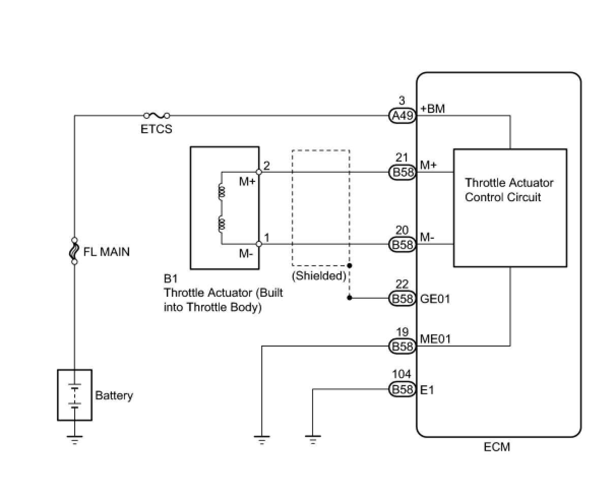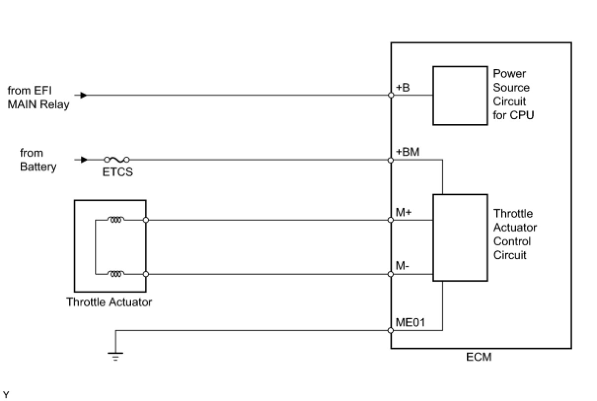 The electronic throttle control system has a dedicated power supply circuit. The voltage (+BM) is monitored and when it is low (below 4 V), the ECM determines that there is a malfunction in the electronic throttle control system and cuts off the current to the throttle actuator.