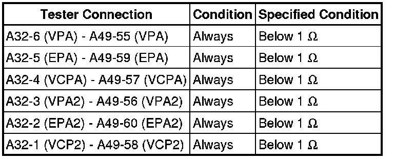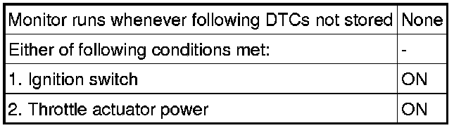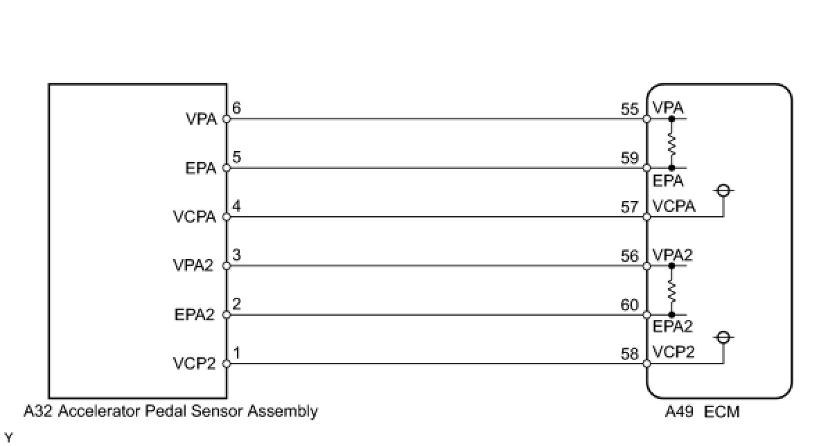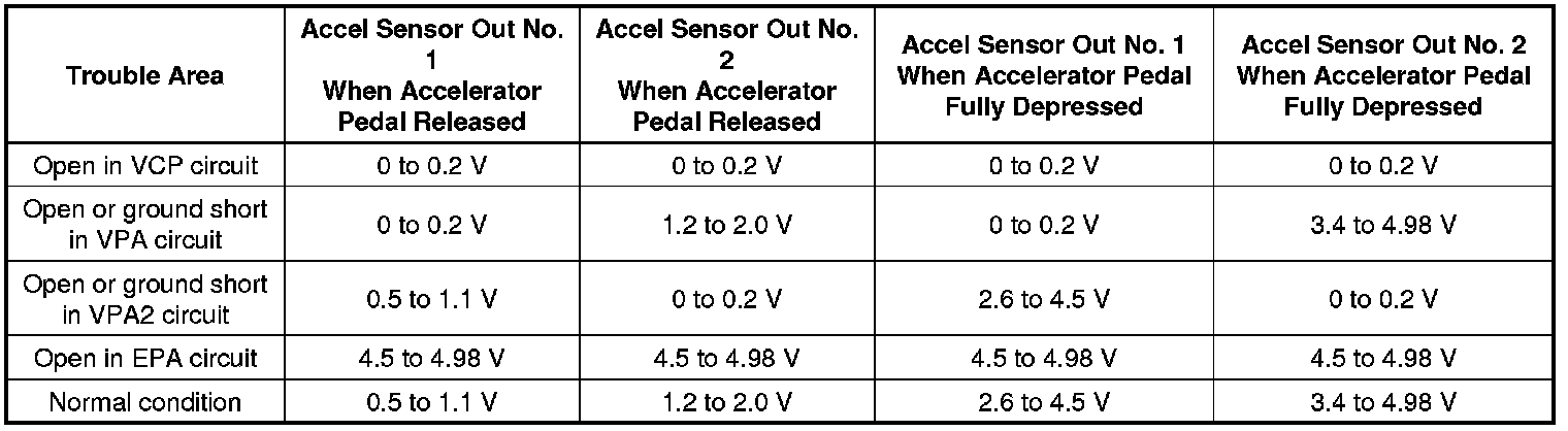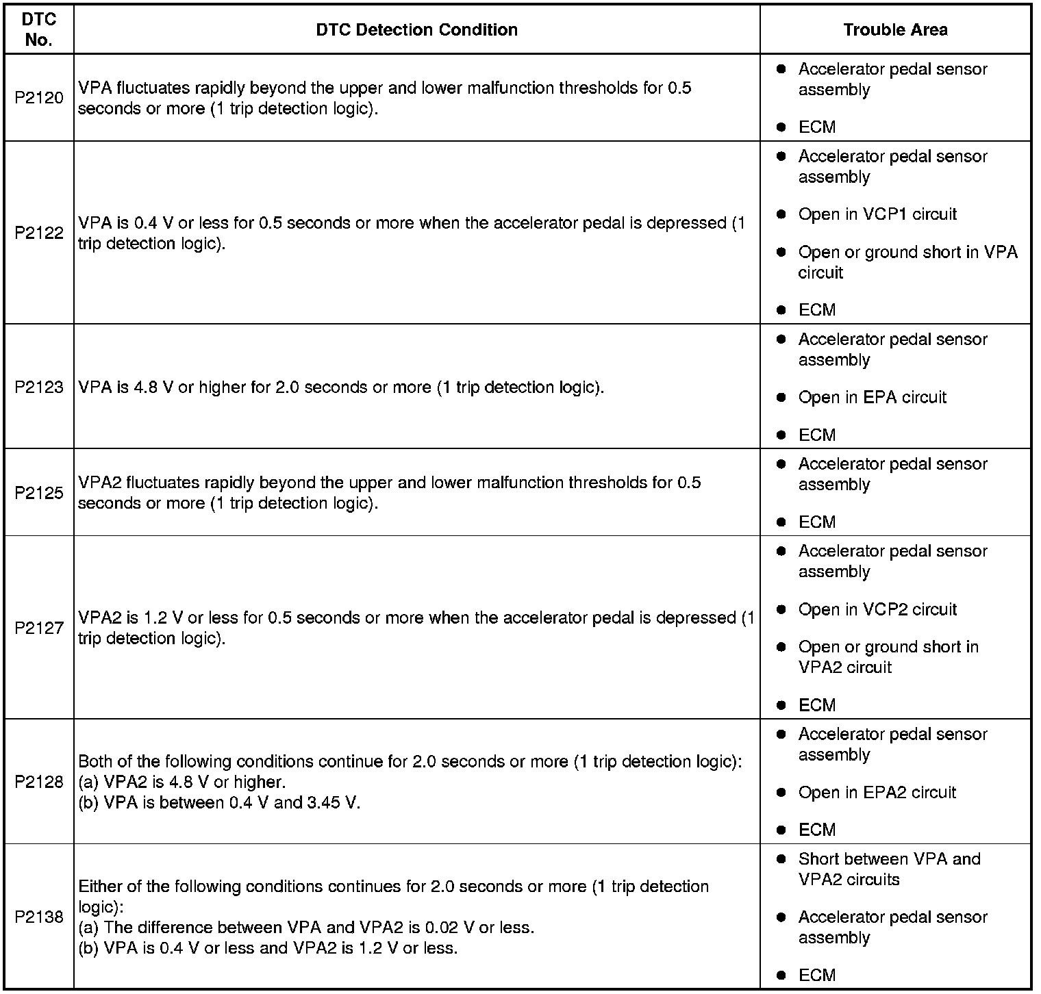 When the output voltage of VPA drops below 0.4 V for more than 0.5 seconds when the accelerator pedal is fully depressed, DTC P2122 is stored.