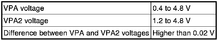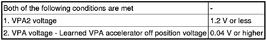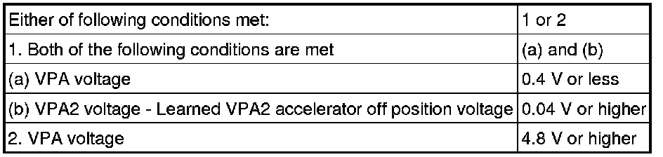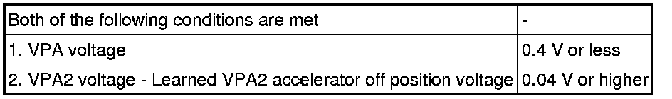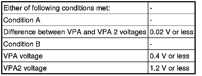 When either output voltage of VPA or VPA2 deviates from the standard range, or the difference between the output voltages of the 2 sensor circuits is less than the threshold, the ECM determines that there is a malfunction in the accelerator pedal position sensor. The ECM then illuminates the MIL and stores a DTC.