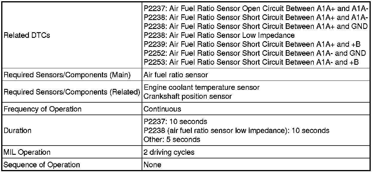 * Although the DTC titles say oxygen sensor, these DTCs relate to the air fuel ratio sensor.