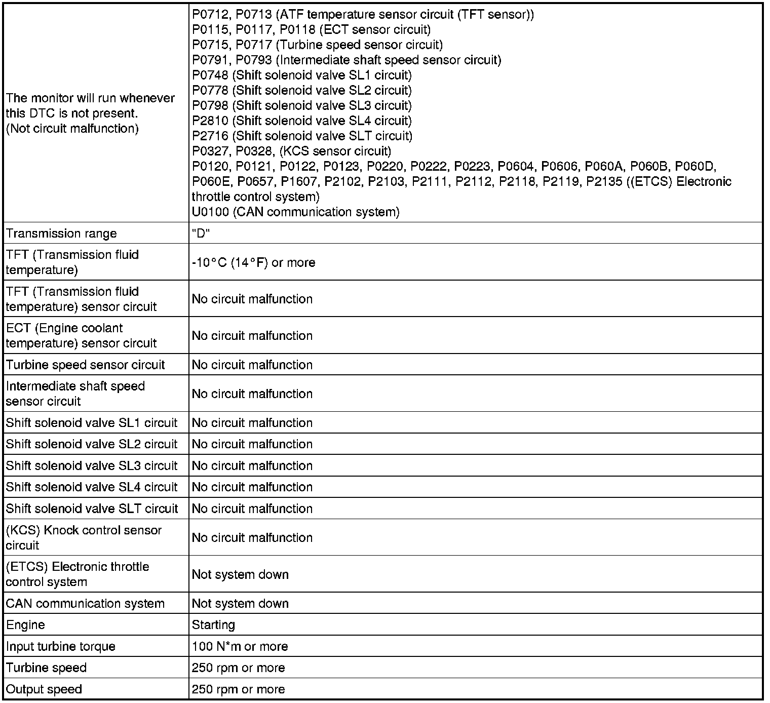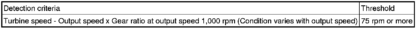 The TCM calculates the amount of clutch slip based on the turbine speed, output shaft speed, and gear ratio. If the amount of clutch slip exceeds a specified level, the TCM will set this DTC and illuminate the MIL.