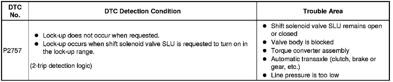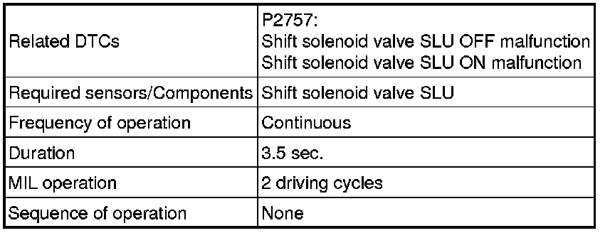 If the TCM detects no lock-up after lock-up has been requested or if it detects lock-up when it is not requested, the TCM interprets this as a fault in shift solenoid valve SLU or lock-up system performance.