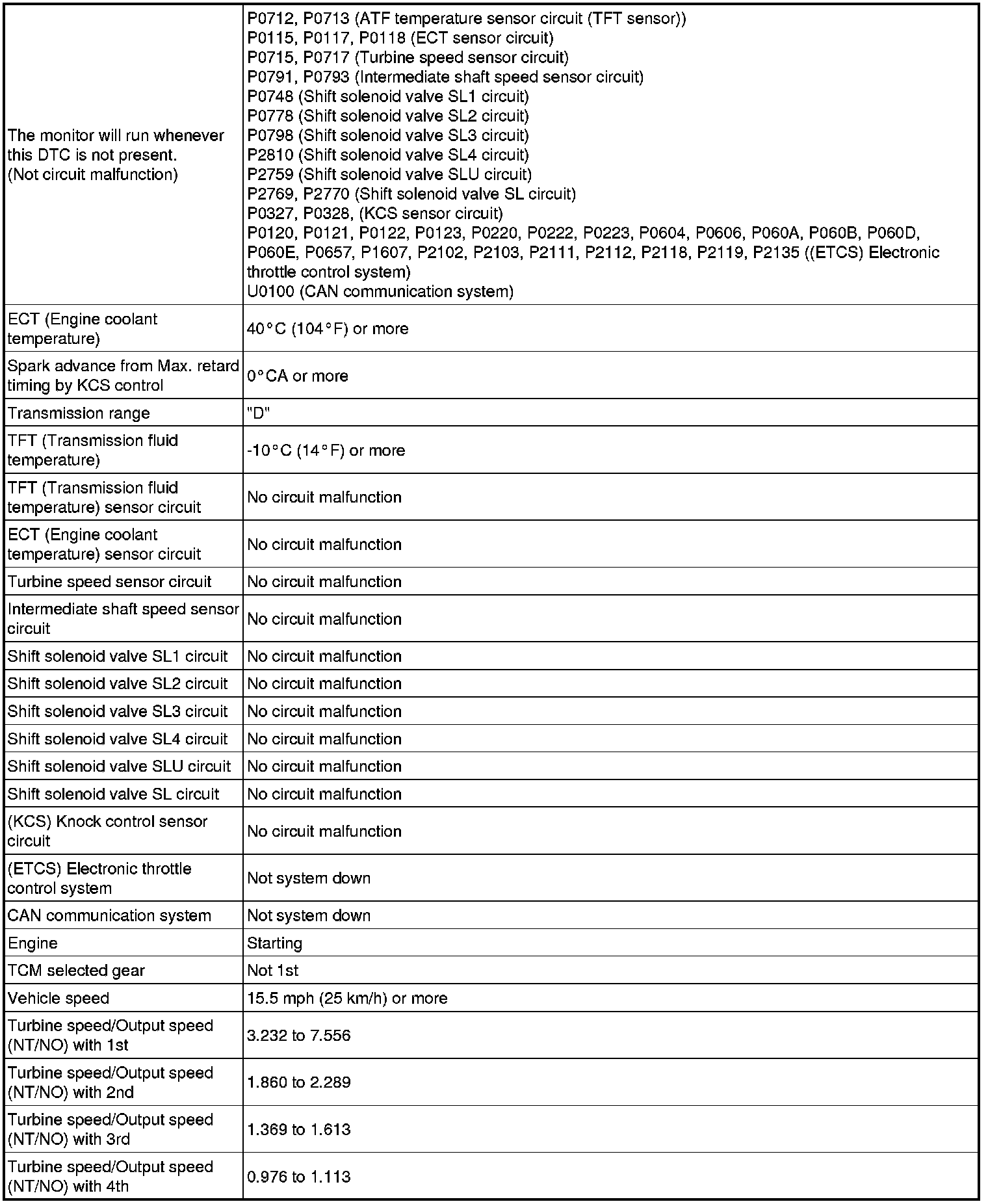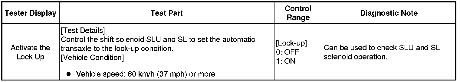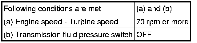 The TCM compares the engagement condition of the lock-up clutch with the lock-up schedule in the TCM memory to detect shift solenoid valve SLU, valve body and torque converter mechanical problems.