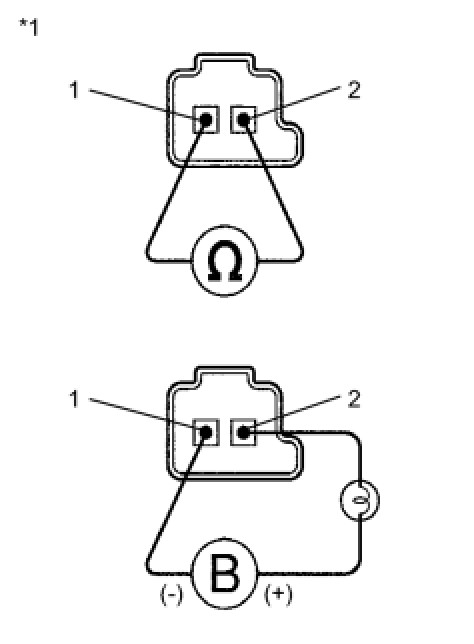 (c) Connect a battery positive (+) lead with a 21 W bulb to terminal 2 and a negative (-) lead to terminal 1 of the solenoid valve connector. Then check that the valve moves and makes an operating sound.