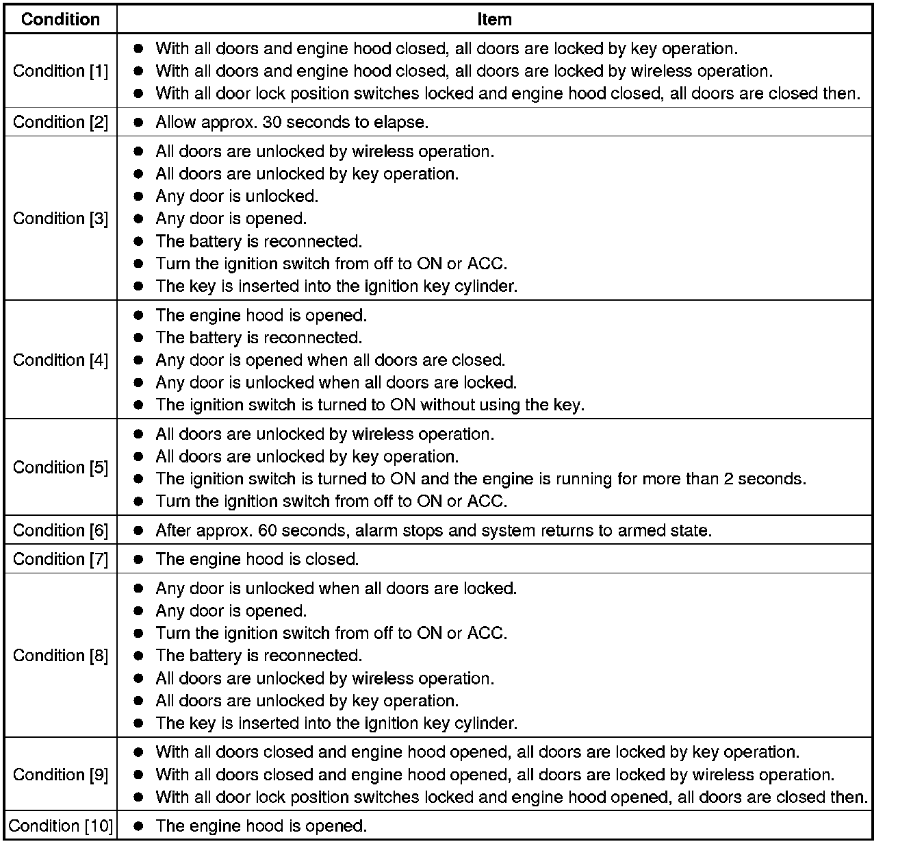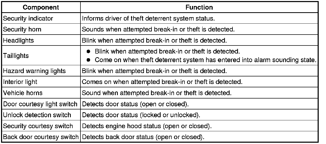 * The alarm function will be activated when someone attempts to forcibly unlock any of the doors or open any of the doors, engine hood and back door while the system is in the armed state.