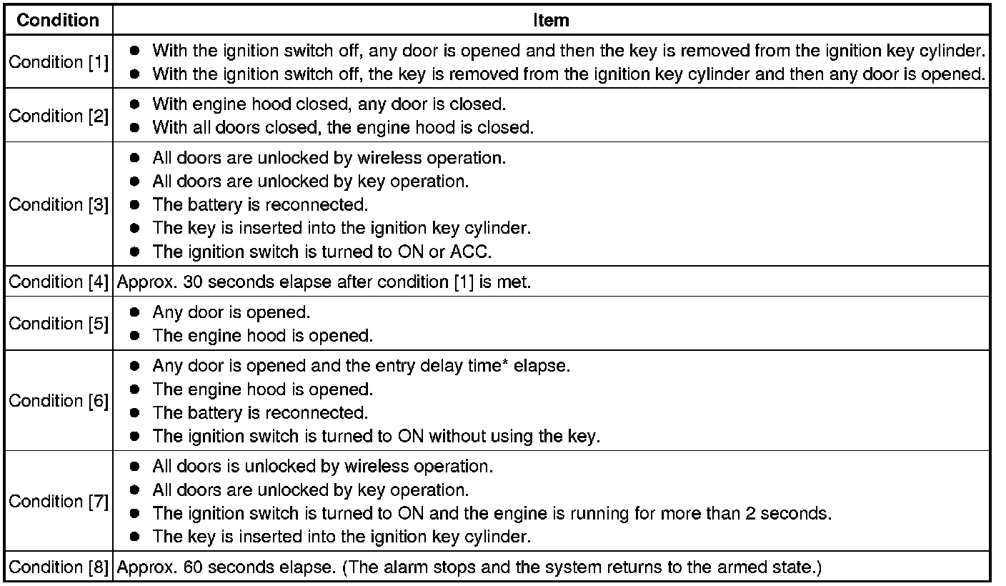 * *: When any door is opened while all doors are closed during passive arming mode, the entry delay time starts. If the switch condition (armed state -> disarmed state (1) or (2)) is met during the entry delay time, the theft deterrent system will return to disarmed state (1) or (2). However, if the switch condition for disarmed state (1) or (2) is not met, the theft deterrent system will recognize it as a theft and set off the alarm. Entry delay time of 0, 14 or 30 seconds can be selected by the customizing function.