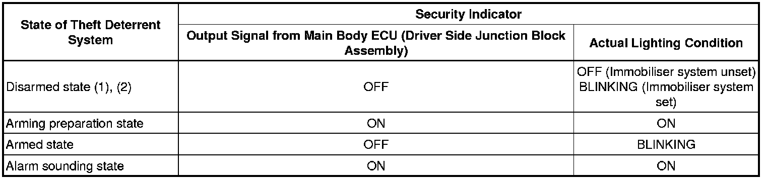 (a) The main body ECU (driver side junction block assembly) outputs a signal to come on the security indicator, according to the state of the theft deterrent system. However, some of the actual lighting conditions of the security indicator are different from the output signals of the main body ECU (driver side junction block assembly).