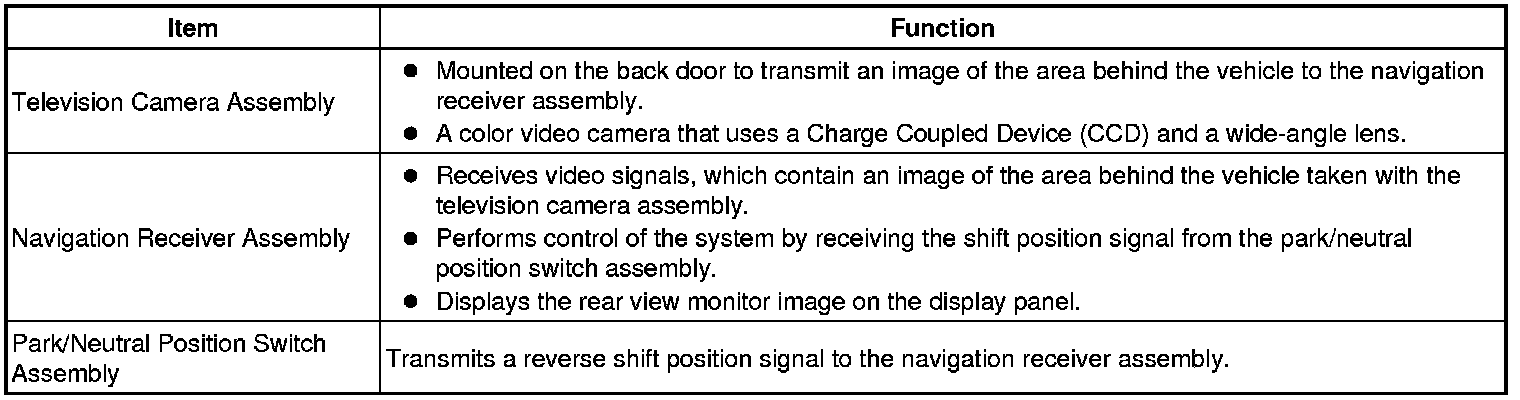 (a) To assist the driver with parking the vehicle by displaying an image of the area behind the vehicle, this system has a television camera mounted on the back door. The system displays the image on the navigation receiver assembly.