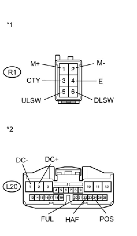 (1) Disconnect the R1 back door lock assembly connector and L20 power back door ECU connector.