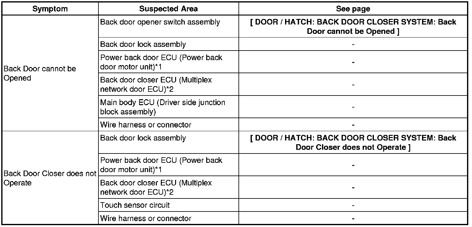 DOOR / HATCH: BACK DOOR CLOSER SYSTEM: PROBLEM SYMPTOMS TABLE