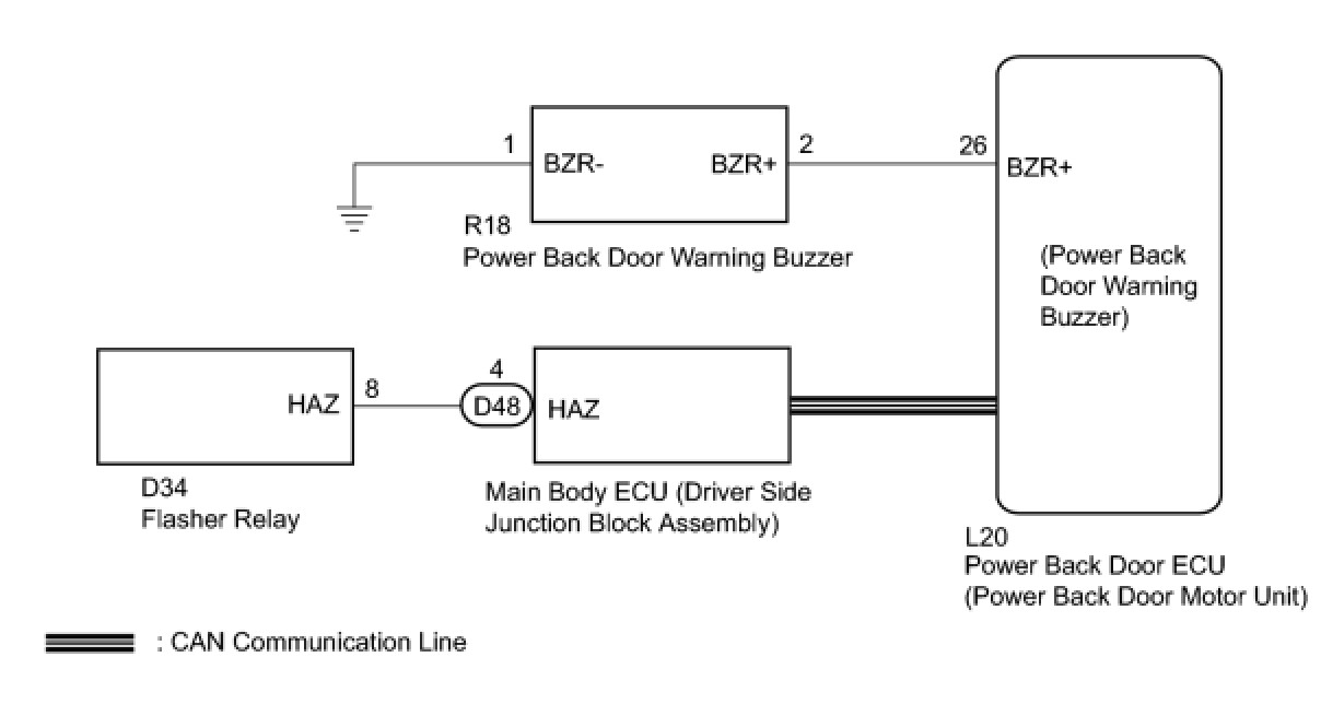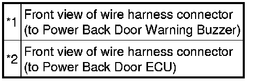 When the power back door warning system does not operate, one of the following may be malfunctioning: 1) power back door warning buzzer circuit, 2) wireless door lock control system or 3) power back door ECU.