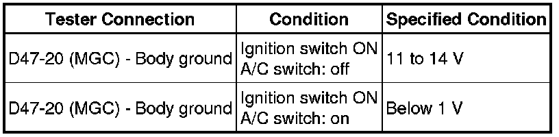 When the A/C amplifier is turned on, a magnetic clutch ON signal is sent from the MGC terminal of the A/C amplifier. Then, the MGC relay turns on to operate the magnetic clutch.