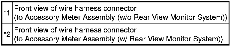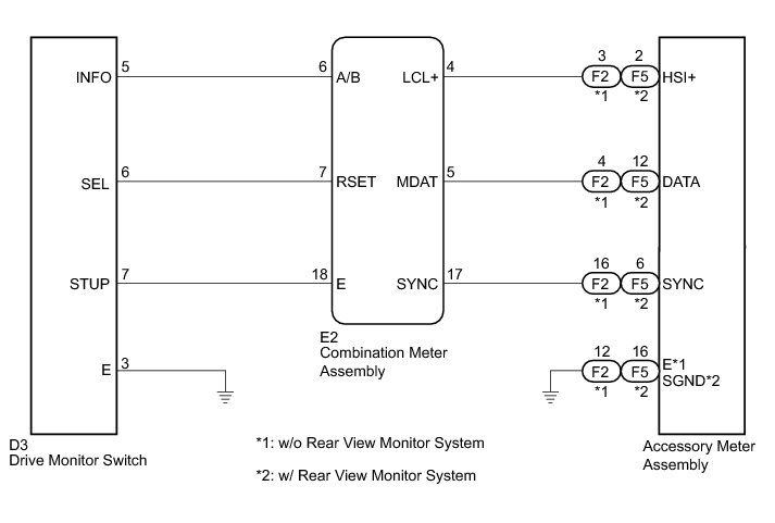 The accessory meter assembly uses this circuit to communicate with the combination meter assembly via the direct line. The accessory meter assembly uses this circuit to receive the drive monitor switch signals from the combination meter assembly via the direct line and multi-information display signal from each ECU through the combination meter assembly via the direct line.
