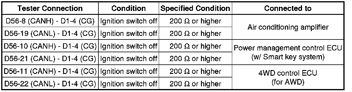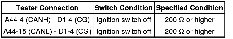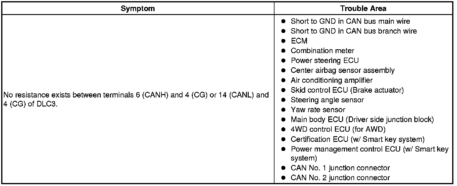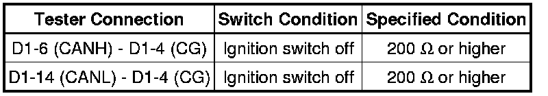 There may be a short circuit between the CAN bus main wire and GND when there is no resistance between terminals 6 (CANH) and 4 (CG) or 14 (CANL) and 4 (CG) of the DLC3.
