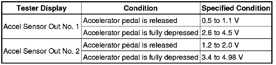 If the result is not as specified, check the accelerator pedal sensor assembly, wire harness or ECM.