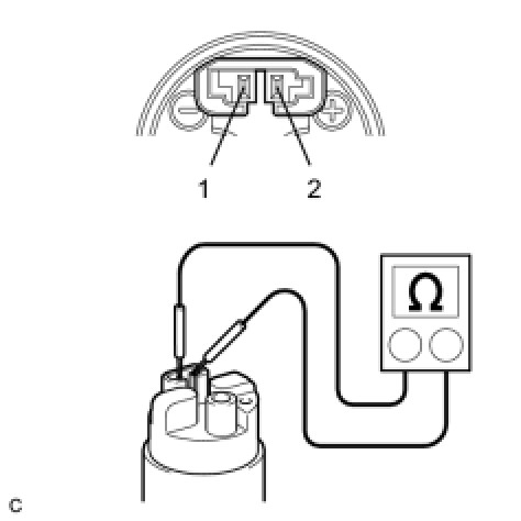 (1) Connect a battery positive (+) lead to terminal 2 of the connector, and a negative (-) lead to terminal 1. Check that the fuel pump operates.
