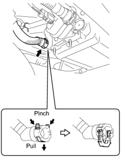 (e) Remove the hose clamp and disconnect the fuel tank to filter pipe hose.