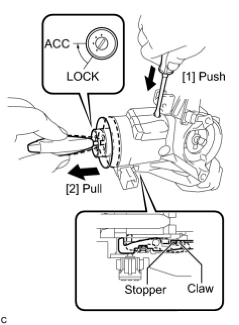 (b) Insert a screwdriver into the hole of the steering column upper with switch bracket assembly as shown in the illustration. Pull the ignition switch lock cylinder assembly until its claw contacts the stopper of the steering column upper with switch bracket assembly.