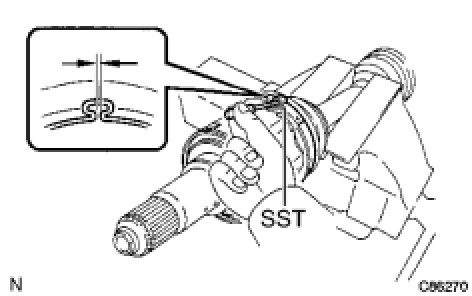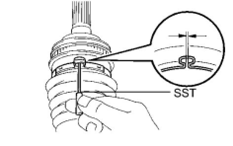 (e) Using SST, measure the clearance of the front axle inboard joint boot clamp.
